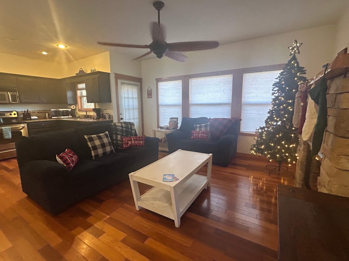 1800 sq feet with master bedroom downstairs . King bed with a private sunroom and bathroom with shower and toilet room. Big living area with wood burning fireplace and large picture windows that overlook the lake . Coffee Bar area with SONIC ice maker Kitchen has gas stove and double oven ,dishwasher and farm sink. Loft area has 1 bedroom with queen bed and 2nd bedroom with 2 single beds 1 full bath upstairs . TV with video games & movies Washer , dryer downstairs Half bath downstairs