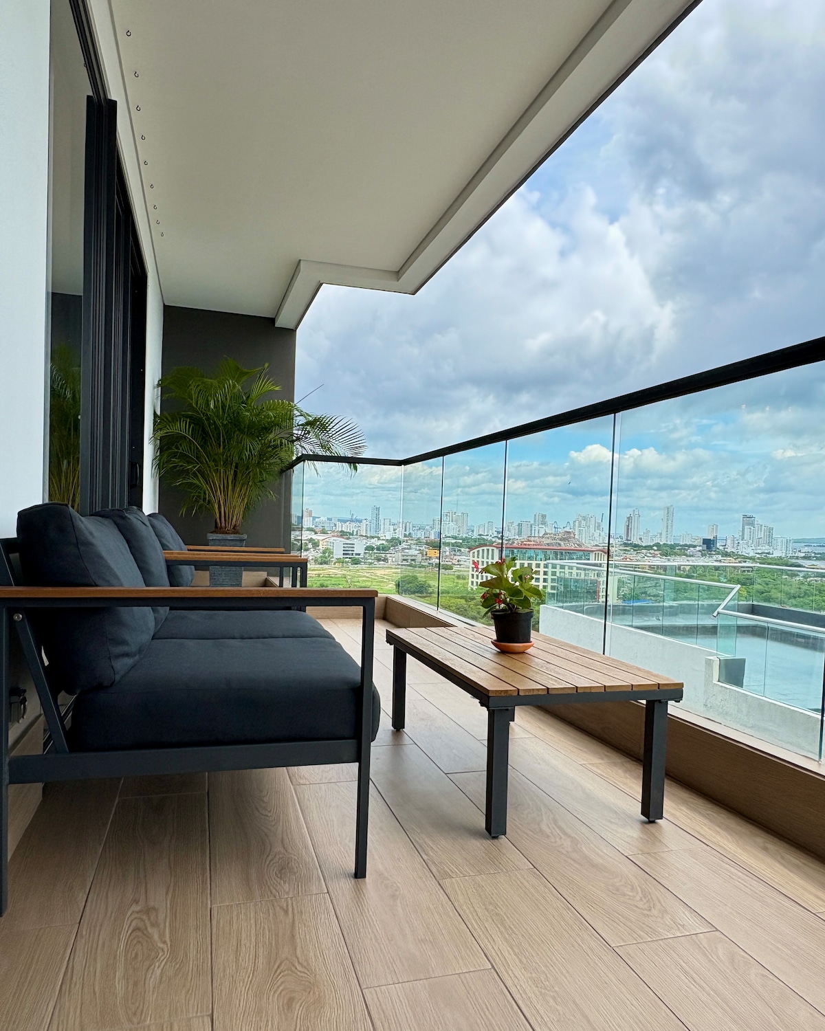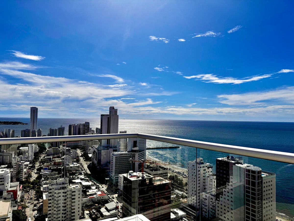 Exclusive 30th floor apartment Morros City with incredible and captivating sea and historic center views. Master bedroom with direct sea view and balcony access. Full kitchen, 2-in-1 washer and dryer, 60" Smart TV, 500MB fiber optic WiFi. Beachfront Bocagrande with luxury amenities: pool, jacuzzi, Turkish bath and gym. Free parking. Ideal for couples seeking the most exclusive experience from the highest available floor in all Cartagena