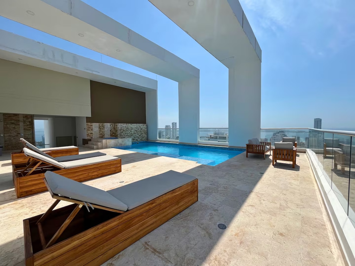 Enjoy Cartagena from this modern 45 m² apartment in the heart of Bocagrande. It features 2 bedrooms (one with a queen bed and one with a double bed), a sofa bed in the living room, two bathrooms, air conditioning in the bedrooms and living room, hot water, and a washing machine. Ideal for up to five people. The building boasts a spectacular rooftop pool and jacuzzi. Strategic location: steps from the beach and boardwalk, restaurants, shops and supermarket. The Historic Center is just 5 minutes