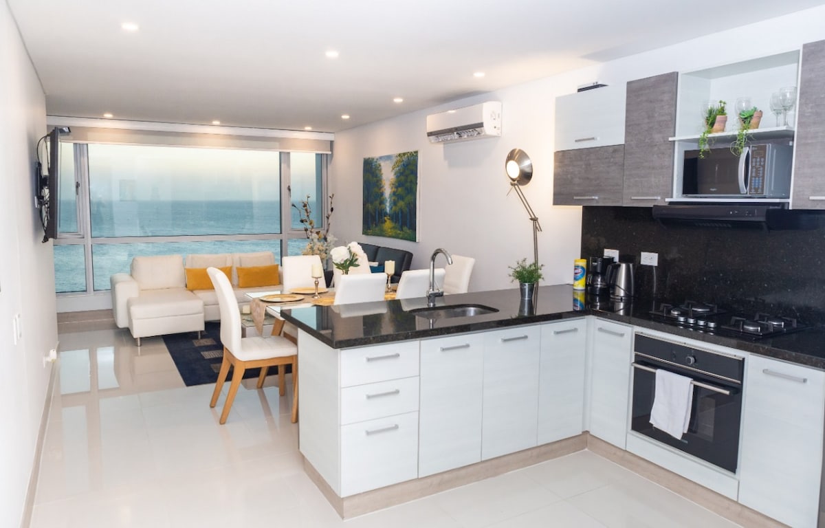 Espectacular Apartamento con vista al mar y a la cienega. Ideal para familia y parejas. Podrás disfrutar de la playa, bellos encuentros en el balcón y las piscinas. Cuenta con todo lo necesario para una estancia inolvidable. A tan solo 5 min del aeropuerto y 15 min del centro historico de la ciudad, con muchas opciones de transporte. La hermosa vista desde el balcón es todo lo que necesitas, quedarás muy feliz y tendrás la mejor de las experiencias!!