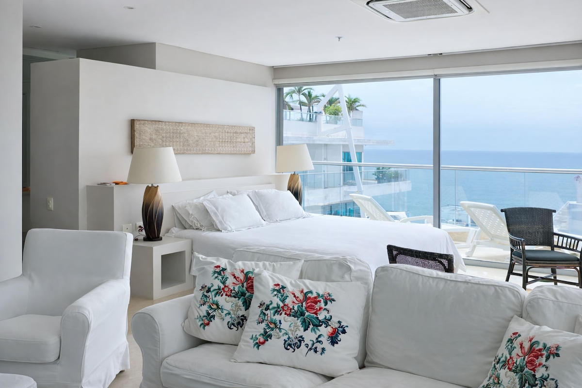 Enjoy a luxury experience in this elegant suite located within the Sonesta Cartagena Hotel. The suite features lagoon and ocean views, a king-size bed and a private bathroom. Bright, spacious and peaceful, it is ideal for a comfortable and relaxing stay. A private terrace with jacuzzi and BBQ is available upon request (additional service).