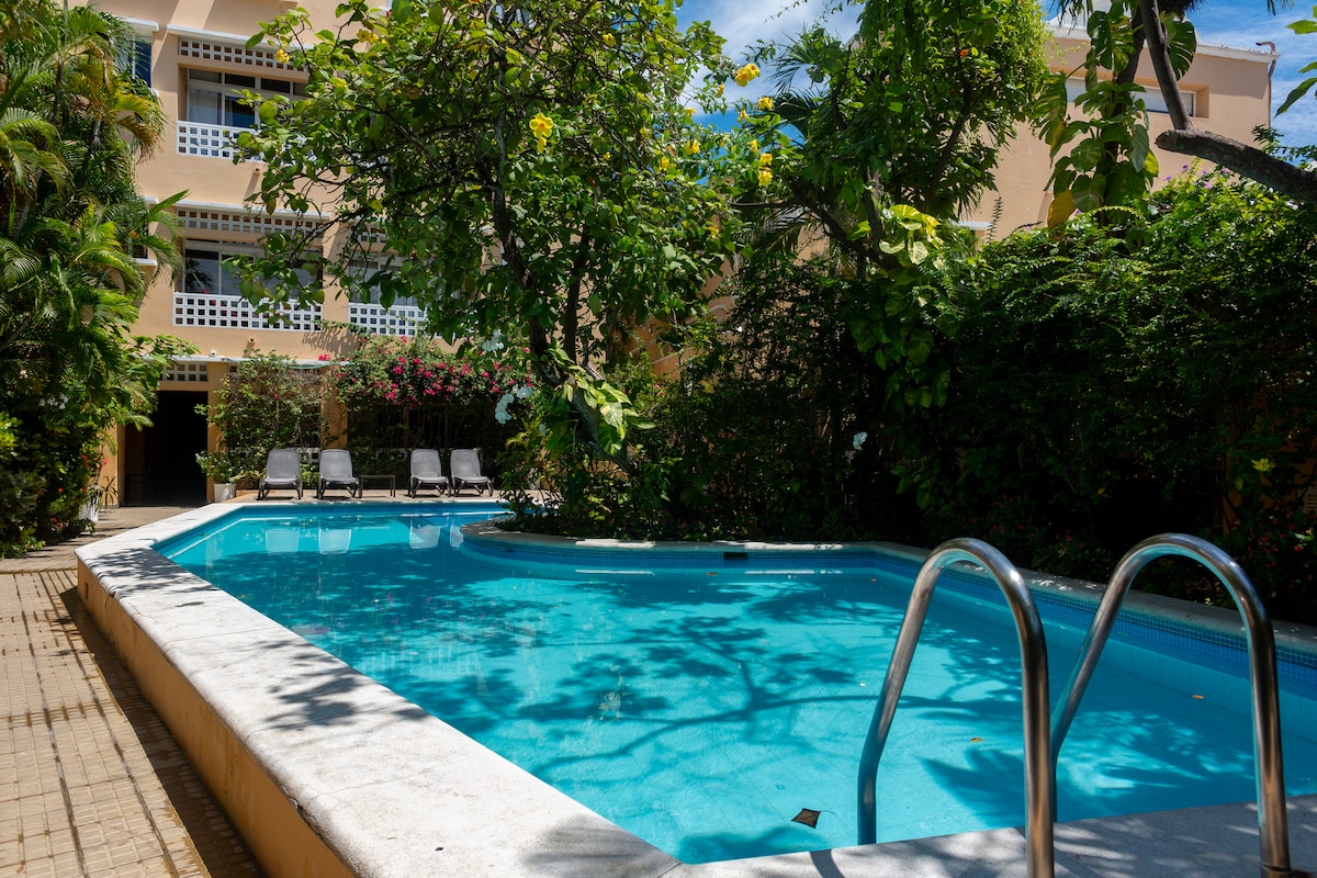 Bright charming open plan apartment, located in the Centro Histórico de Cartagena, in the neighborhood of Getsemani. Overlooking a peaceful pool garden with lush vegetation and humming birds, this apartment is a little oasis of tranquility in the vibrant Caribbean rhythms of Cartagena de Indias. Only 2 minutes walk from Plaza de la Trinidad and Centro Convenciones. Secure, 24h security guard. A/C. Rooftop terrace with loungers and great views over the sea and the old city.