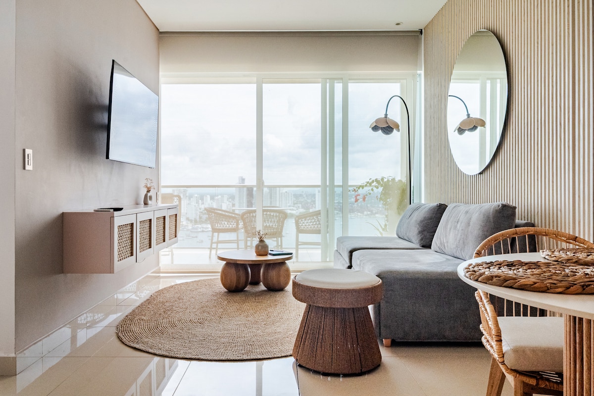 APARTAMENTO NUEVO! tenemos una excelente ubicación para aquellos que buscan cercanía a lo lugares atractivos de nuestra ciudad. El apartamento es acogedor y cómodo, pensamos en que el huésped tenga todo y su estadía sea confortable. Aquí encontrarás desde buenas camas, confortables colchones pensando en tu descanso, lavado y secado de inmediato, teatro en casa, una cocina equipada y un balcón con vista muy linda con dirección al mar. 5min aeropuerto 🚕 5min 🏝️ más cercana 🚕 8min del centro🌆