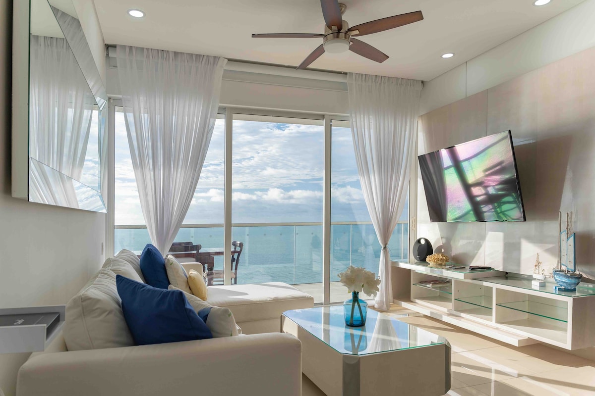 You'll LOVE The BLEU Suite: ✨Modern & Exclusive: Pool+Sauna+ Turkish Spa+ Coworking+24-Hr Security ✨Top floor suite with unobstructed views of Ocean+City ✨5 mins walk from airport ✨Steps from Beach+ 5 mins to Walled City ✨Huge Balcony+lounge seating ✨Maid Service included ✨ Tour Concierge Included - Special DISCOUNTS on tours ✨King Bed with premium mattress ✨Smart TV & High speed wifi ✨Private Soak Tub ✨Private Balcony Cinema ✨Self Check-in Smart Lock ✨Blackout Blinds ✨Luggage storage
