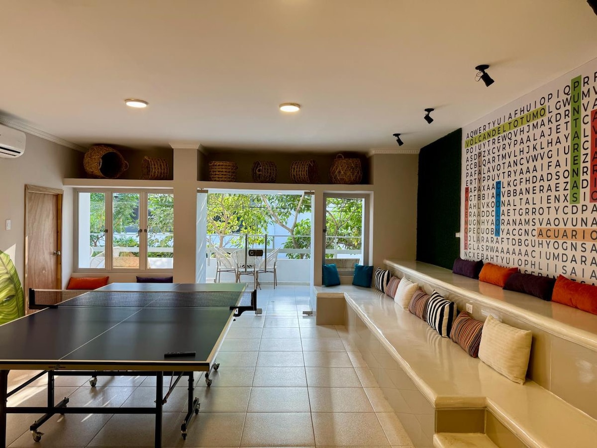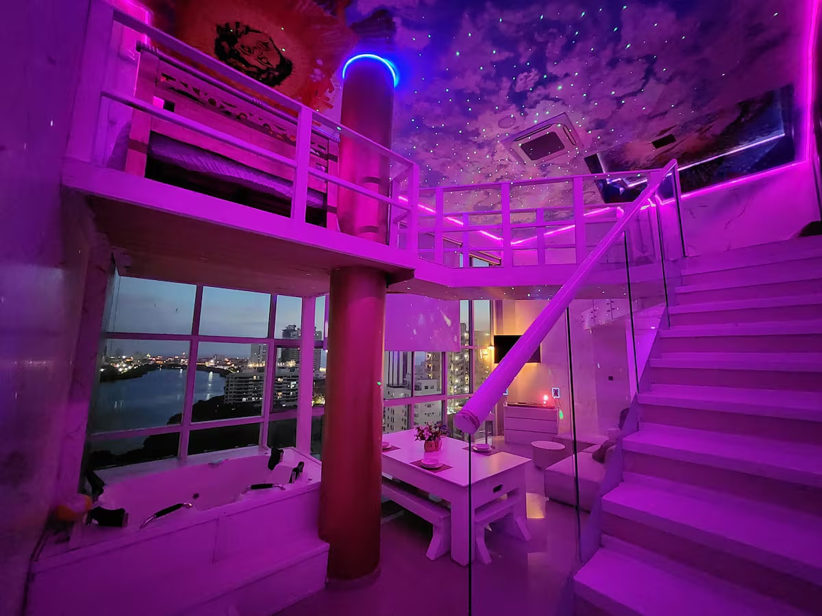 This exclusive duplex offers a one of a kind luxury experience in Cartagena. Just 5 minutes from the airport and close to the historic center, it has a jacuzzi in the room with panoramic view, pool table, Balcony pin pon, and video game machine. In addition, its projector will allow you to enjoy movies on a giant screen. Private balcony, outdoor shower. Every detail is designed to provide you an indulgent and luxurious stay, combining comfort and entertainment in one place.