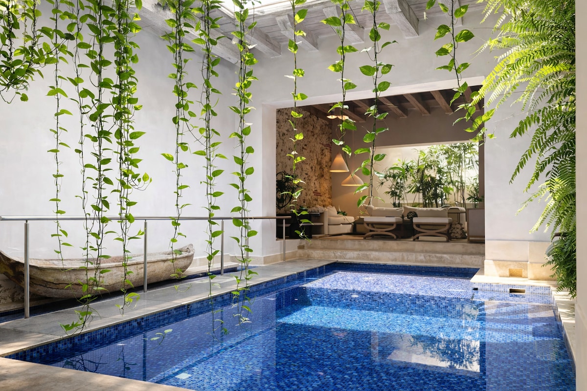 This stylish unique house is located in the Centro Historico of Cartagena, in the trendy neighbourhood of San Diego. It is a tasteful home for a romantic hideout. This property offers a refreshing private pool, a small rooftop terrace perfect for sunset cocktails, A/C where needed and the option to cater for 5 guests. Right next to great bars and restaurants, this stylish Historical Colombian home is filled with great details, high ceilings, wooden beams, antique bath, and quality amenities.