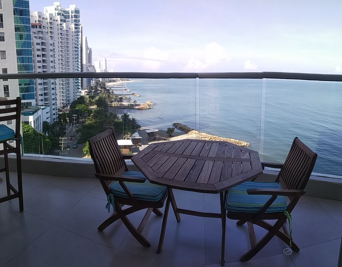 Cartagena Ed Spiaggia. Acogedor, hermoso y amplio apartamento frente a playa, elegantemente amoblado y con comodidades para disfrutar días inolvidables. Salida directa al mar. Espectacular terraza con comedor, asoleadoras, hamaca y hermosa vista. Fácil acceso a 5 min. de aeropuerto y 10 min. del centro histórico. Terrazas con piscinas, jacuzzis, saunas, juegos acuáticos,gimnasio y vista 360°. Restaurantes y supermercados. Empleada disponible adicional.Check in 3 pm,check out 11am sin excepción