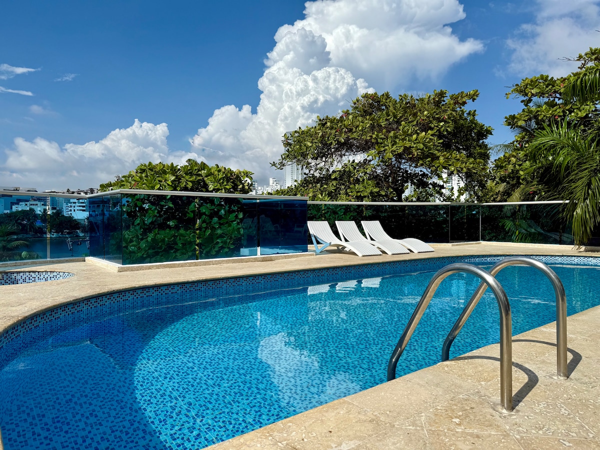 Lujoso y espectacular apartamento con Vista Frente al mar, a la ciudad y a la bahía. Ideal para grupo familiar y grupo corporativo. Podrás disfrutar de la playa, bellos encuentros en el amplio balcón y las piscinas. Cuenta con todo lo necesario para una estancia inolvidable. A tan solo 5 min del centro historico de la ciudad, con muchas opciones de transporte. La hermosa vista desde el balcón es todo lo que necesitas, quedarás muy feliz y tendrás la mejor de las experiencias!!