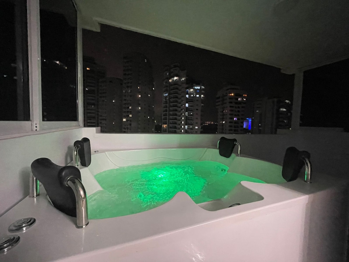 Beautiful apartment on the 34th floor of one of the most prestigious building in Cartagena. 1 bedroom with 1 full size bed, 2 full bathrooms. Fully equipped kitchen, dining room area, private jacuzzi on balcony overlooking the ocean and Tierrabomba island. Spectacular view! Beach two blocks away. Restaurant walking distance. Rooftop with pool and jacuzzi, and another pool on the first floor both overlooking the sea.