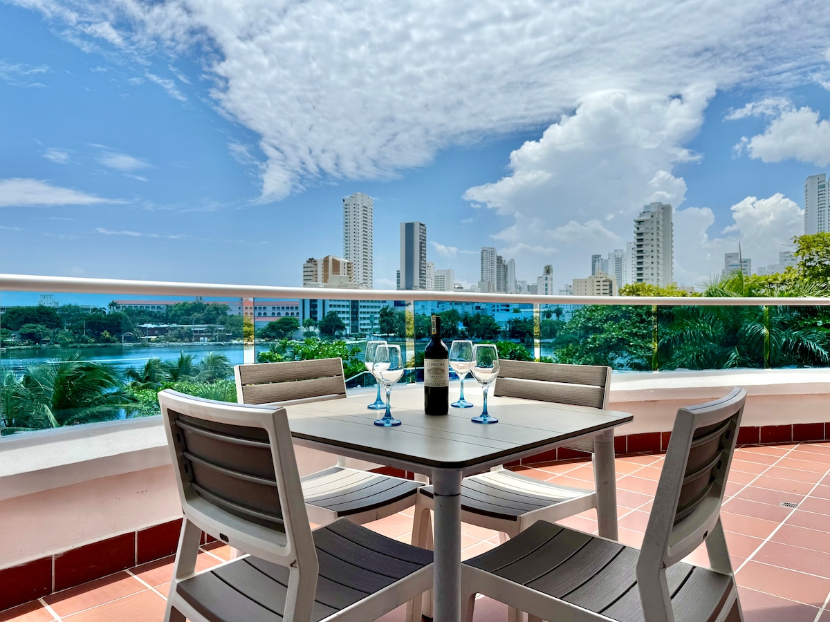 Apartamento frente al mar, a 5 minutos del centro histórico y del aeropuerto. Ideal para descansar con una espectacular vista al mar Caribe. El edificio tiene: piscina de adultos y niños, jacuzzi, gimnasio, sauna, turco, bbq, parque y seguridad 24 hs. Gracias a su ubicación muy central todo el grupo podrá tener fácil acceso a todo: actividades culturales, acuáticas, visitas a las islas, conocer el centro histórico, llegar rápidamente al aeropuerto, ir a Barranquilla, etc.