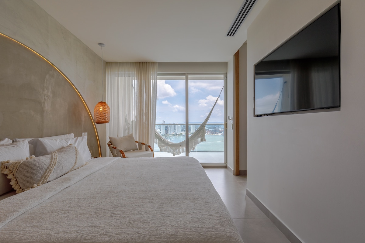 You are in the perfect place! This modern apartment has everything you need; You will be in a modern skyscraper, in front of you you will have the sea, the beach and the pool, all this in the heart of the Colombian Caribbean. From the balcony you will have vast panoramic views of ancient Cartagena de Indias, the Caribbean Sea and beautiful colorful sunsets. Everything is close. You can walk to the walls feeling the breeze, and sit in a colonial cafe enjoying the wonders of the ancient city.