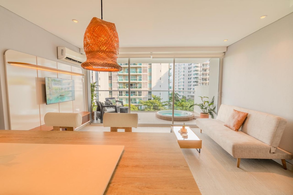 Welcome to our charming, fully-equipped apartment in Morros City, Bocagrande, Cartagena! Here, your perfect escape to Caribbean serenity meets modern comfort. Enjoy breathtaking views of the Walled City from your window and discover the beach just steps away. With gastronomic delights like Crepes and Waffles and the Mallplaza 5-minute walk, your Cartagena experience will be unforgettable. Immerse yourself in the tropical ambiance with pool and jacuzzi, private parking and 24/7 security.