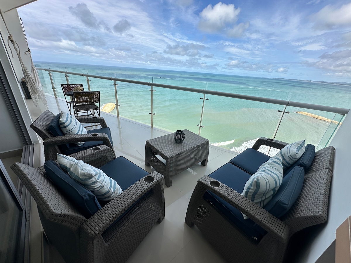Lujoso y espectacular apartamento con Vista Frente al mar, a la ciudad y a la bahía. Ideal para grupo familiar y grupo corporativo. Podrás disfrutar de la playa, bellos encuentros en el amplio balcón y las piscinas. Cuenta con todo lo necesario para una estancia inolvidable. A tan solo 5 min del centro historico de la ciudad, con muchas opciones de transporte. La hermosa vista desde el balcón es todo lo que necesitas, quedarás muy feliz y tendrás la mejor de las experiencias!!