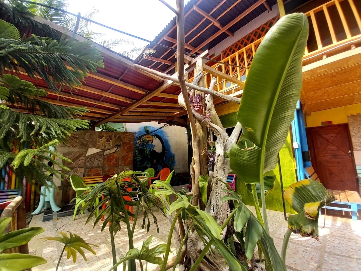 Este lindo MINI ESTUDIO es una habitación con baño y cocina privados. Ideal para estadías de ocio o trabajo. Ubicado en el barrio Canapote (Daniel Lemaitre), barrio local, casa de huéspedes muy tranquila, rodeada de plantas. El centro histórico y playas de Marbella se encuentran a 10 minutos en taxi. La playa del barrio Crespo está a 10-15 minutos caminando. Un alojamiento muy económico para visitar Cartagena.