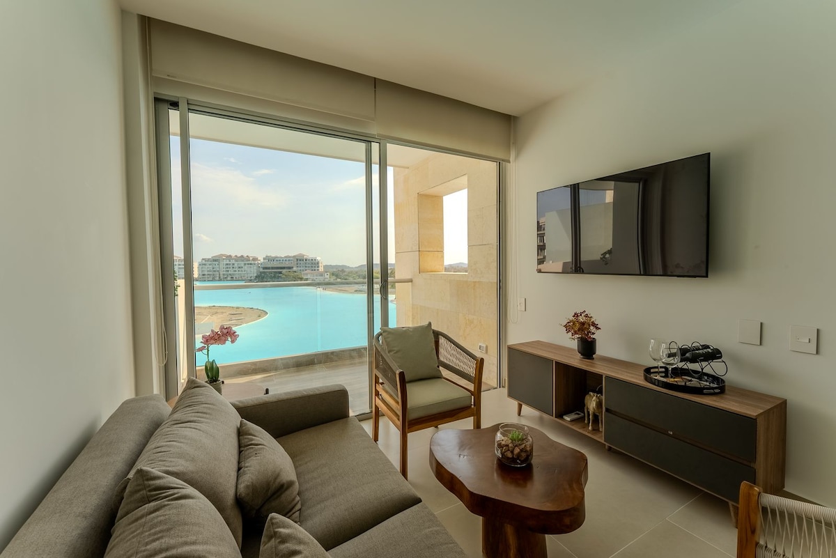 Discover this exclusive apartment in Cartagena, perfect for relaxation: - Located in a complex with an impressive Crystal Lagoon of crystal-clear waters, jacuzzis, a beach club, and a gym. - Enjoy the warm Caribbean climate in a luxurious and comfortable setting. - Just 15 minutes from the airport and 20 minutes from Cartagena’s historic center, where history and culture await you. Message me and experience a unique getaway in this tropical paradise.