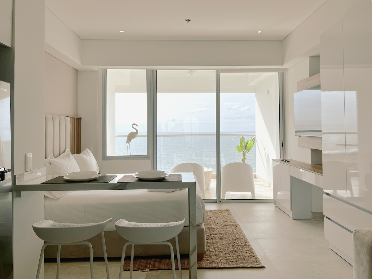 Apartamento Loft nuevo con una gran terraza, que te brinda la mejor vista al mar y la ciudad amurallada de Cartagena. Visita La playa que está a 5 minutos caminando. La ciudad amurallada está a 15 minutos caminando o 2 min en uber. El aeropuerto está a 10 min Uber. El apartamento cuenta con 3 alcobas con baño privado cada una, más un baño completo en la zona social. El edificio cuenta con 2 picinas en el último piso, así como Sauna. Estacionamiento gratuito.