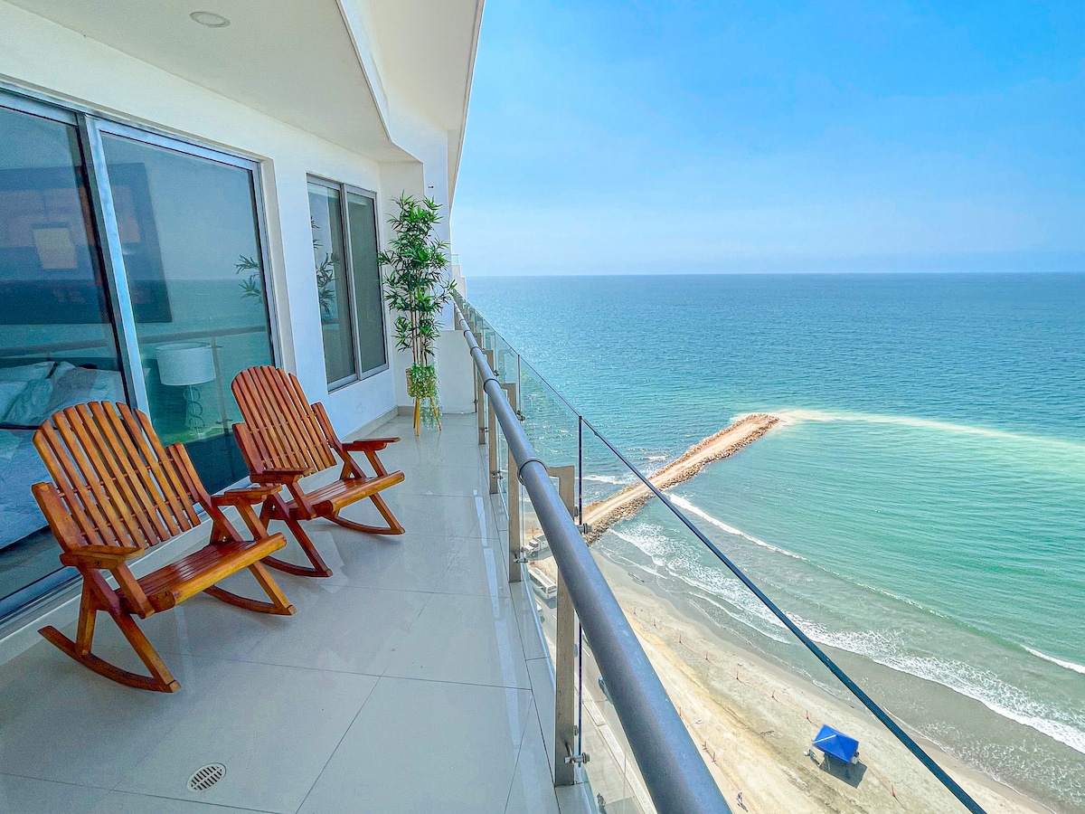 Discover elevated luxury in our 34th-Floor Ocean View Suite, The ICONZ Sky Residence, located in Cartagena's safest and most upscale area, steps from the beach and 5 minutes to Walled City Wake up above Cartagena’s skyline with views via floor to ceiling windows & lounge on a huge comfortable balcony. You'll LOVE: ✨Modern design & A/C throughout ✨Amaizing Pool, Gym, Sauna, 24-Hour Security ✨Maid & Concierge ✨Premium mattress, linens & pillows ✨24-hour Self Check-in with Smart Lock ✨Smart TVs