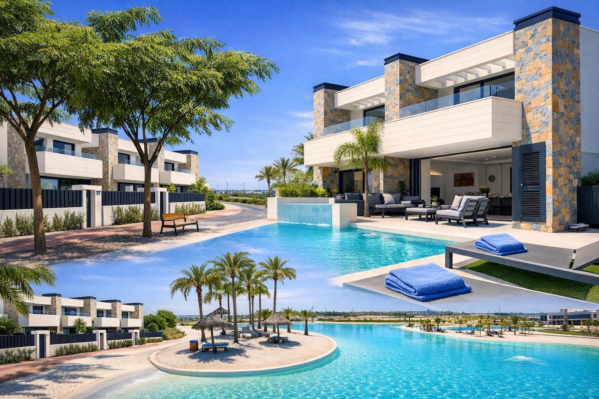 A luxury 3 bedroom villa situated on Europe’s largest ‘crystal’ lagoon. A unique award winning resort. Set over 3 floors, the property can host between 6 and 8 people (8 if using large sofa bed). Located on a beautiful new development that includes a breathtaking crystal lagoon, a Chiringuito beach bar on an island, several beaches, an a la carte restaurant, a gym, 18 hole mini golf, putting practice green, and sports courts. A resort like no other