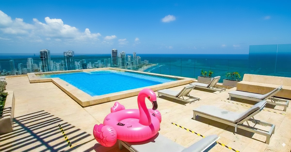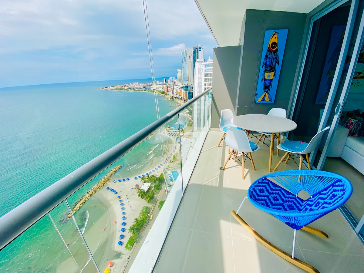 Exclusive 30th floor apartment Morros City with incredible and captivating sea and historic center views. Master bedroom with direct sea view and balcony access. Full kitchen, 2-in-1 washer and dryer, 60" Smart TV, 500MB fiber optic WiFi. Beachfront Bocagrande with luxury amenities: pool, jacuzzi, Turkish bath and gym. Free parking. Ideal for couples seeking the most exclusive experience from the highest available floor in all Cartagena