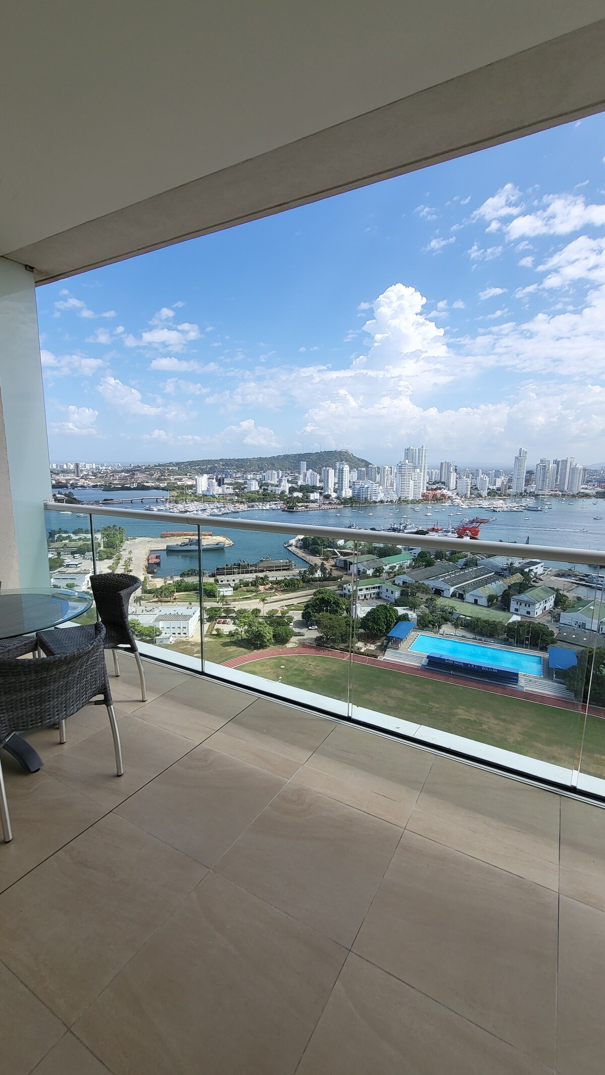 On the 15th floor of a new building in front of Cartagena’s famous bay, you can enjoy amazing views and sunsets over the bay and city. In the safest neighborhood the apartment is equipped with fast wifi, powerful A/C everywhere, fully equipped kitchen, washing machine, iron/board, hot water, TV, pool, jacuzzi, private parking, Co working & more Kick back and relax in this calm, stylish space. ONLY PRE-REGISTERED GUESTS
