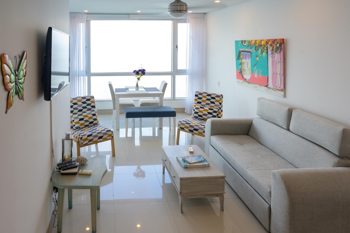 Luxury apartment with oceanfront view located on the 12th floor of the building. Ideal for families and corporate groups. We provide a ‘Welcome Gift’ to our guests. Centrally located in the tourist area of Bocagrande, with restaurants, shopping and tourist attractions all within walking distance. Public transportation options include taxis and buses. The apartment is only a 5 minute taxi ride from the historic center from the walled city 'La Ciudad Amurallada
