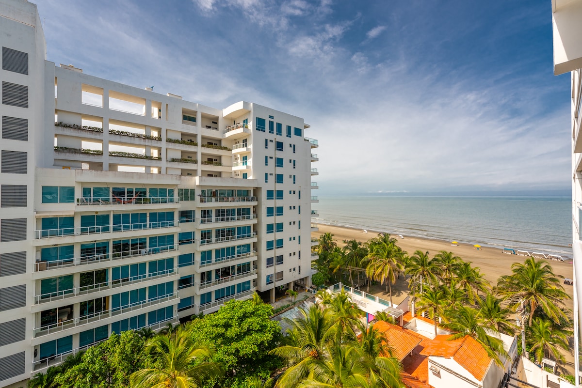 Disfruta un elegante apartamento frente al mar en Bocagrande, con vista directa al Caribe. Cuenta con 2 habitaciones, 2 baños, sala amplia con sofá cama, cocina totalmente equipada, WiFi de alta velocidad y balcón privado con sillón colgante. Aire acondicionado en todas las áreas. Perfecto para familias y grupos que buscan comodidad, ubicación privilegiada y acceso inmediato a la playa. Todo está pensado para una estancia moderna, práctica y relajante.