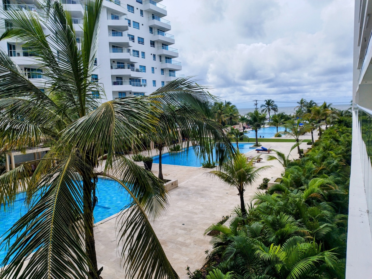 Pasa momentos inolvidables en familia o con amigos en un apartamento nuevo frente a la playa en SEAWAY 935. A 5 minutos del Aeropuerto y del centro histórico de Cartagena, en el sector de mayor proyección turística de la ciudad. Apartamento con capacidad entre 4 y 5 personas. Gran vista, 1 alcoba amplia con 1 cama doble, 1 cama + tarima y 1 amplia sala comedor con 1 sofacama. Unidad residencial con salida directa a la playa, 3 piscinas, restaurante/bar, gimnasio, cancha de tenis y supermercado