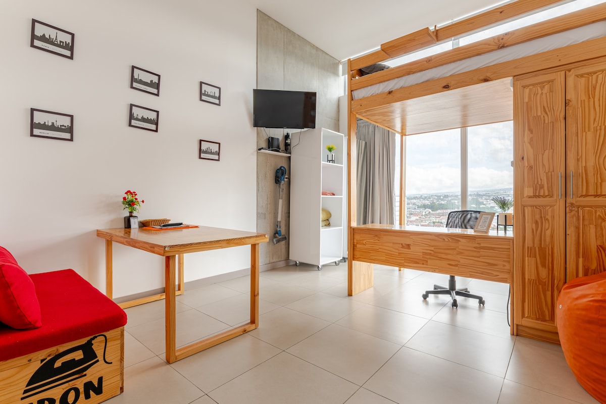Te ofrecemos un aparta en un piso 18, con vista panorámica y brisa fresca. Este loft moderno combina estilo y comodidad con un balcón integrado, cortinas blackout para mayor confort, wifi y parqueo privado. En el piso 25 contamos con una piscina infinita, área de iworking y más. Estamos ubicados en una zona segura y céntrica de Curridabat, donde tendrás todo a tu alcance. Como Súper Anfitrión Top 10% en Costa Rica, garantizo atención rápida y dedicada para que tu estadía sea inolvidable.