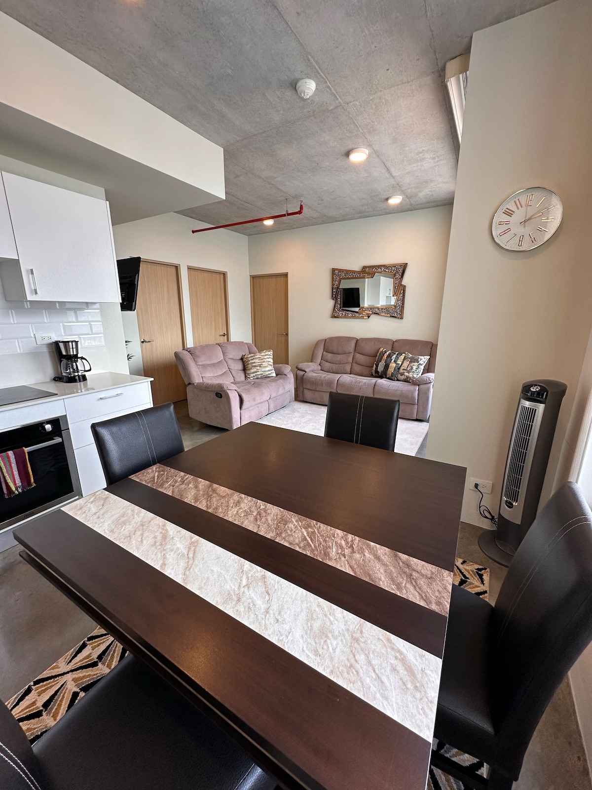 Discover our Bohemian Sky Retreat on the 18th floor, a blend of bohemian elegance and comfort with stunning city views. Enjoy vibrant decor, a plush living area with a smart TV, and a fully equipped kitchen. The serene bedroom promises a restful night beside mesmerizing skyline views. Steps from cafes, dining, and attractions, this urban oasis offers an unforgettable city experience.