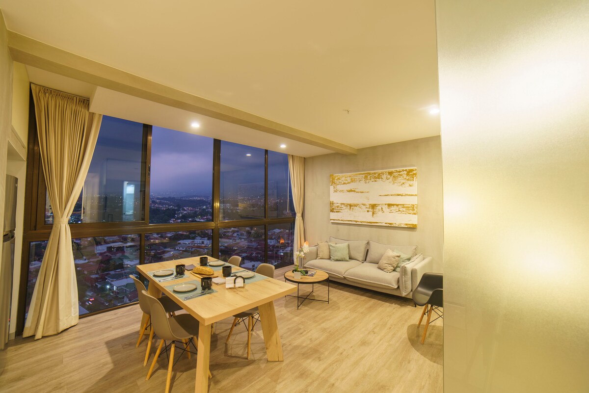 Embrace comfort in this centrally-located 1-bedroom condo, just 15 minutes from San José. From the 12th floor, enjoy stunning sunrise views over the city and mountains. The interior boasts high-speed WiFi, state-of-the-art kitchen appliances, elegant decor, and a plush bed for ultimate relaxation. The building offers an impressive array of amenities, including a semi-Olympic pool, saunas, gym, co-working space, fire pits, game room, and rooftop terraces with panoramic urban views.