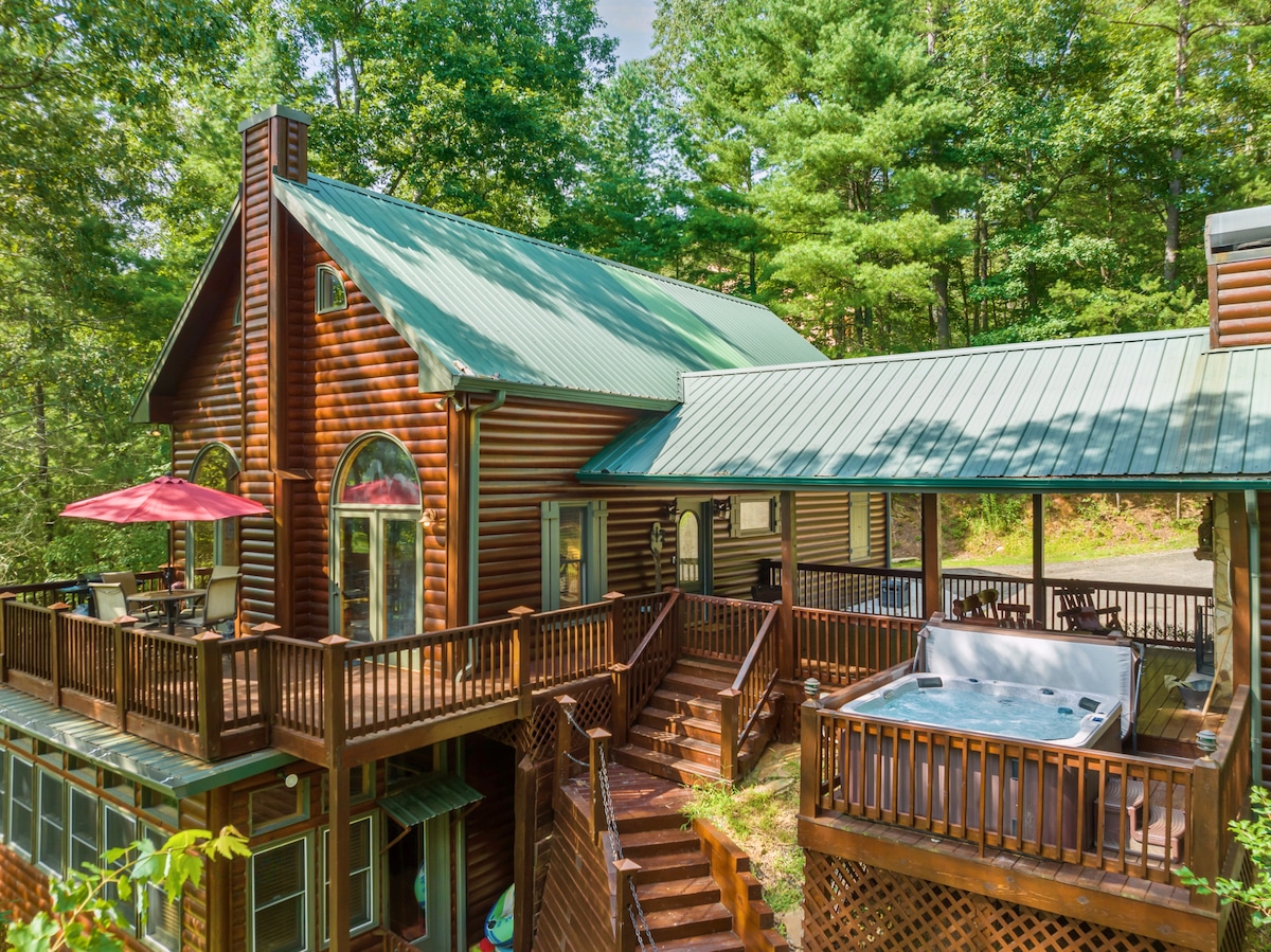 Your Blue Ridge Mountain View Escape awaits! Enjoy breathtaking, layered 50-mile mountain views from this immaculate log cabin. Designed for relaxation and romance, with multiple outdoor decks, private hot tub, cozy indoor and outdoor fireplaces, fire pit, and pool table. Perfect for special occasions or couples featuring two King suites separated for privacy. Updated and stocked with essentials, it blends rustic charm with modern comfort; located exactly between Blue Ridge and Ellijay.