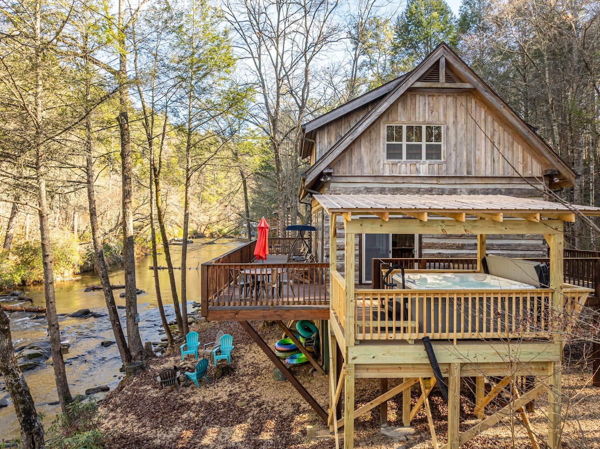 This River Front Cabin is tucked away in the Blue Ridge Mountains. Located right on a flowing creek, you can hear the water from each of the bedroom balconies. The bottom level porch has a hot tub to relax in! The cabins gated community offers river tubing, fishing and many parks. While having the far away feel & scenery you are only 20 mins away from Historic Downtown Ellijay. The area is full of hiking trails, waterfalls, fishing, seasonal apple picking and white water rafting.