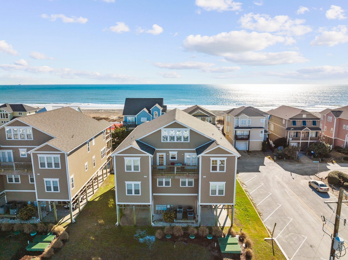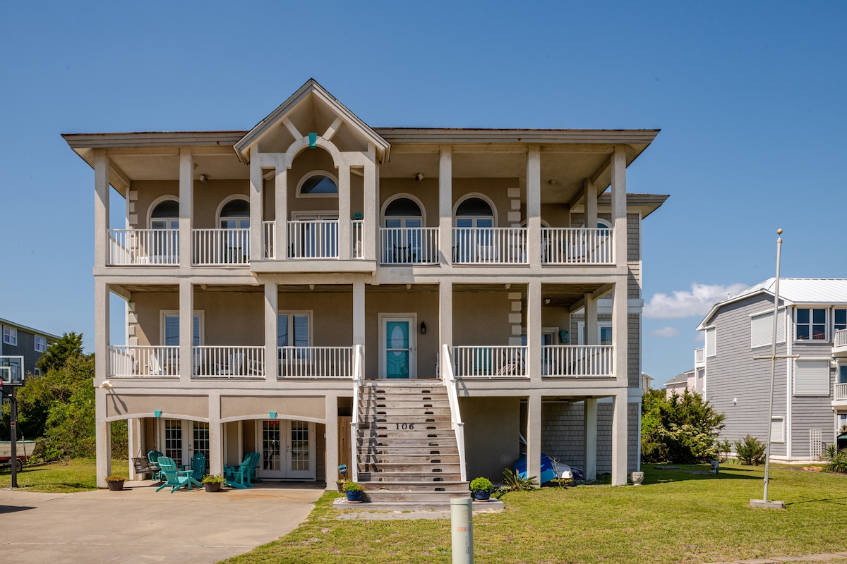 Beautiful, spacious 5 bedroom, 5,000 sq ft house in Atlantic Beach, NC steps away from the beach. Three-story villa with patios upstairs, a full bar, game room and kitchen downstairs. Ideal for families and large groups.