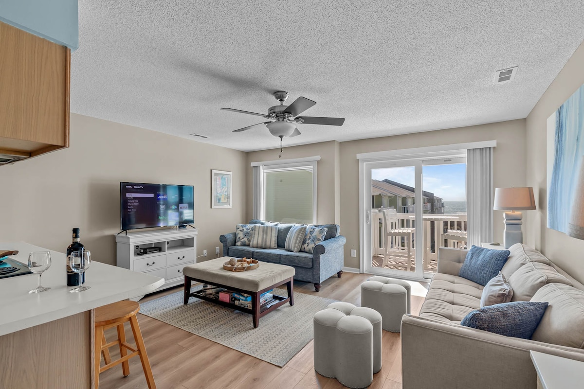 King Bedroom Suite Condo - Walking Distance to the Beach!! Towels and Linens Included. Open concept with great natural light. Many upgrades over the last few years, but most recent changes include a shiplap, making the room feel layered & cozy, new brass pendants and zellige backsplash. 1 bedroom with a king bed and queen pull out couch in the living room. Oceanfront gated community with 2 outdoor pools and heated indoor pool, tennis courts, grills, and gym!
