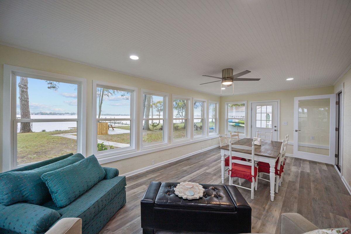 *Breathtaking Sunrises & Sunsets water view *Sunroom 3 season porch. *Overlooking Jarrett Bay. * 2 bed, 2 bath. Sleeps up to six guests. * Launch your own boat or kayaks or rent across the street * Located 15-45 min to Beaufort, Atlantic Beach, Shackleford Banks, Cape Lookout, NC Aquarium * Game room, ping pong, foosball, yard games * Beach chairs, umbrella * Great location for Beach-goers, Duck Hunters , Cape lookout fishing *Fire Pit