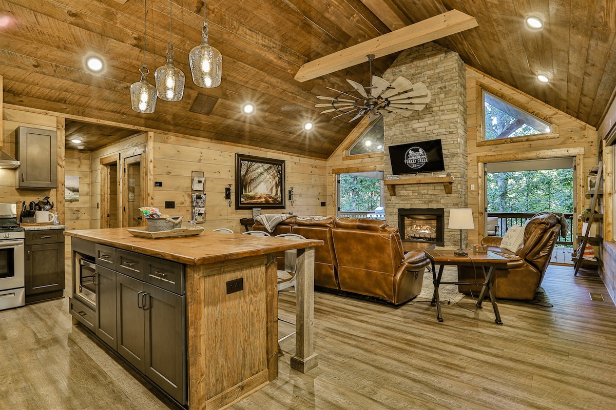 "Evermore" is a unique Treetopper designed for couples who desire a little more. Located in the gated resort style community of Big Canoe, "Evermore" sits on a hillside overlooking beautiful Lake Petit and McElroy Mountain. The interior features a plush King bed, large shower with rain shower head, heated tile floors, remote gas fireplace, remote controlled window treatments, smart tv, open airy kitchen with beautiful finishes. The hot tub is only a few steps away on the private terrace deck!