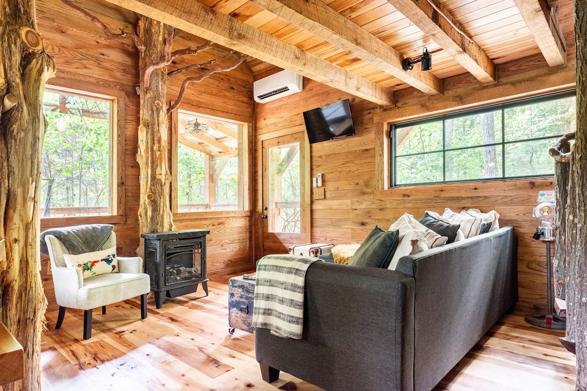 FoResTree House is the creation of two Foresters with a love of uniquely designed spaces that capture and highlight the beauty of the Forest and all the products it has to offer.The tree house is situated on the lower half of our 11 acre property surrounded by mature hardwoods.Artistically crafted with native woods from the area, professionally decorated with a blend of vintage and reclaimed materials.Check out video on YouTube ForesTree House.Come relax, be inspired, and enjoy this quaint gem!