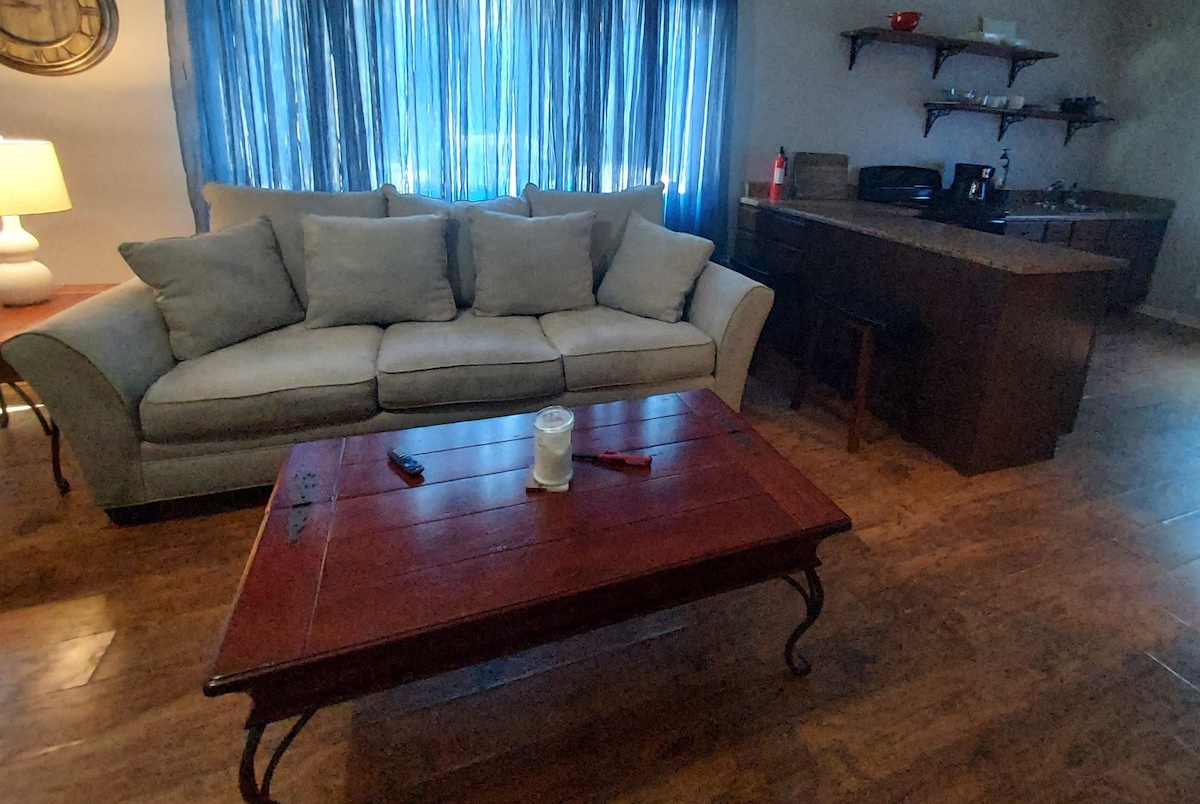 Better than most hotels. PRIVATE unit w/separate entrance & privacy fenced yard. Private suite w/bathroom (no standing shower) Huge bathtub fridge/freezer microwave, air fryer, hot plate, toaster & K cup coffee maker. Queen bed, quality sheets, couch & table, dresser & closet space. patio furniture , grill and fire pit. Beautiful & quite location. PETS allowed w/ pet fee of $25 per day