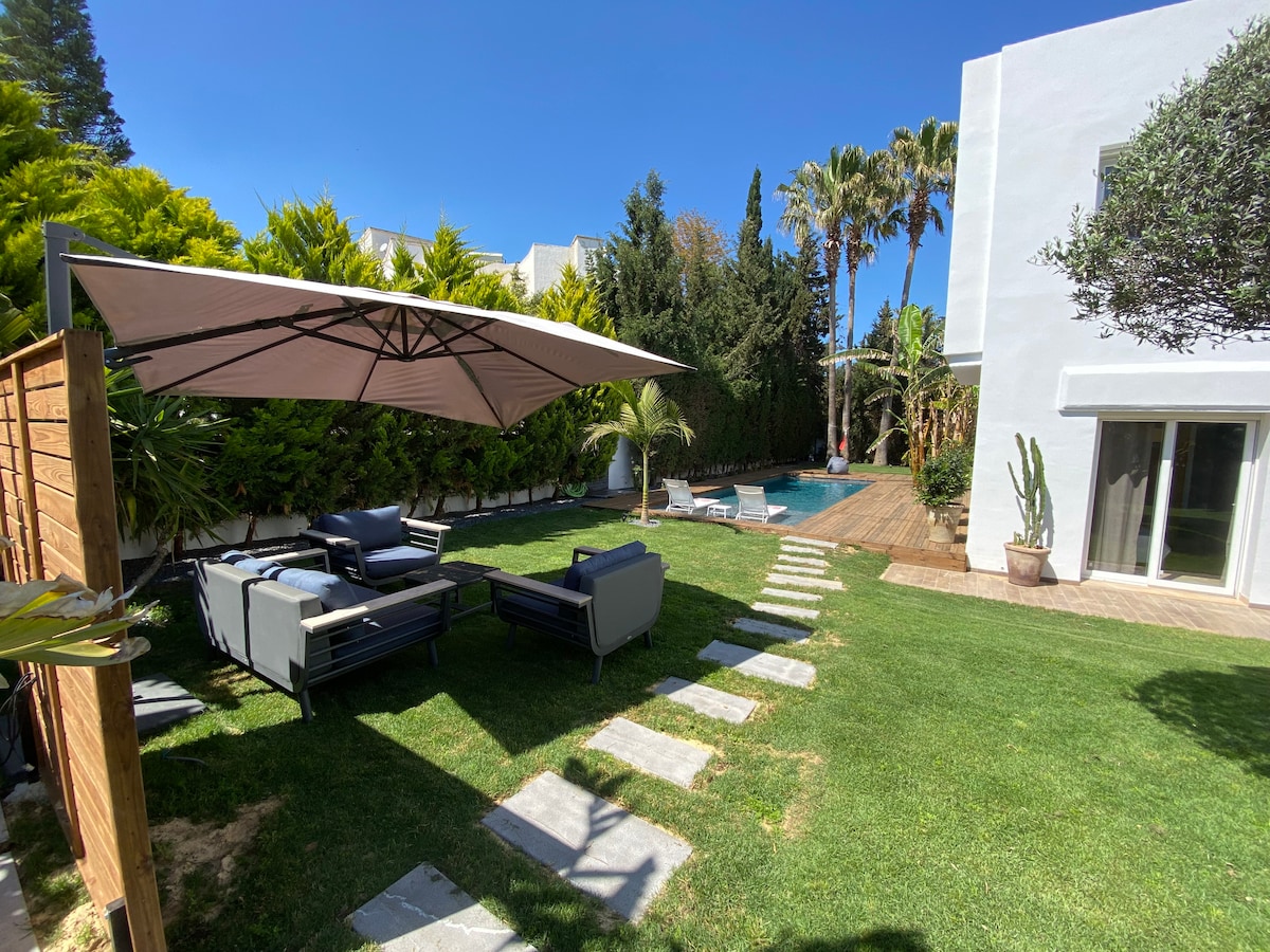 Cozy 390m2 villa with a 500m2 breathtaking garden, and a 12/4m swimming pool. It has two parental suites, two double bedrooms, four bathrooms, a kitchen and a garage. Richly equipped. The villa is a part of Le Royal Hotel and Spa residence in Yasmine Hammamet, highly secured area.The beach is within a 5min walk. Quiet and secure, close to shops and restaurants.The villa is entirely air-conditioned. We provide: Coffee machine, Wifi, Netflix, Baby bed, Barbecue,Washer…