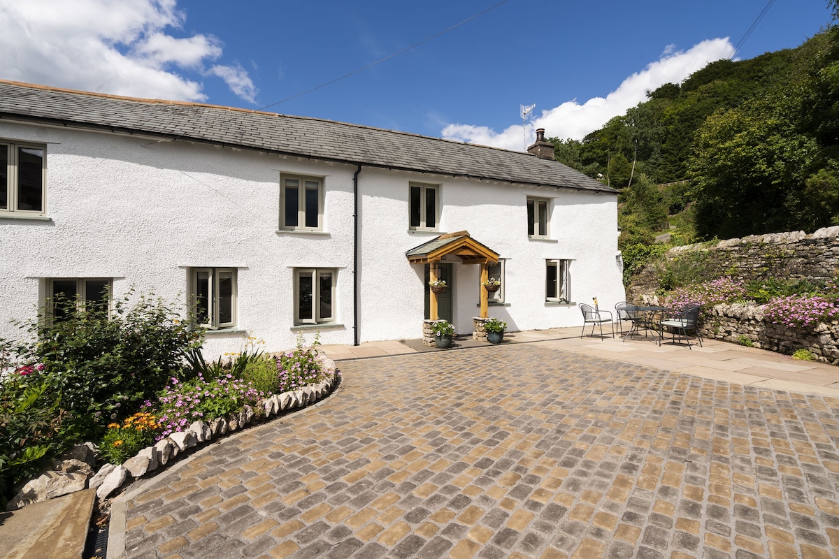 A romantic, stylish and cosy cottage for two in the beautiful Lake District National Park, half a mile from the shores of Lake Windermere and a 20 minute drive from Junction 36 of the M6. We are dog friendly. Our 250 year old cottage features modern rustic decor, u/f heating, log burner, super-fast internet, Smart TV, Sonos sound system and a complimentary podPoint 7kw EV charger. There are many wonderful walks and bike rides available from the front door. Stays start Mondays or Fridays.