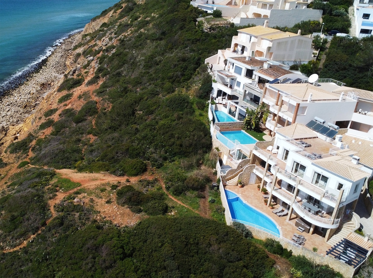 A beautiful contemporary townhouse in an elevated village centre location, 90 seconds from the beach (you can hear the waves crashing from the terrace) with stunning sea views from two terraces. No car needed as just a 2 minute walk to dozens of restaurants and of course there's that hot tub on the roof. Ideal for couples, small groups and families. Close to some of the Algarve's finest golf courses.