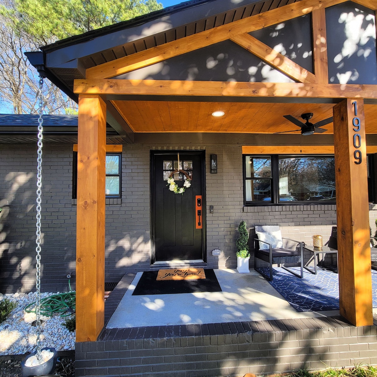 This unique ranch is 2 miles from downtown Raleigh. Stylish, modern, comfortable, clean, quiet, your home away from home. Inside, Primary br has a comfy king bed, desk &chair. The 2nd bedroom has a comfy queen bed, 3rd br has two comfy twin beds. The bathroom has a Bluetooth speaker/fan to play music while you're getting ready for your plans. High speed wifi and smart TVs/. Coffee is available to make while you relax the front porch or floating deck. You're going to LOVE it @ the Noliahouze!