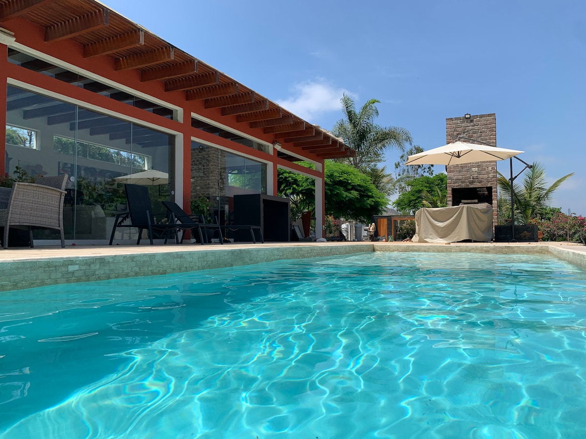 Escápate a nuestra casa de campo nueva y totalmente equipada, ideal para hasta 10 personas. Disfruta de una gran piscina privada, terraza, parrilla, horno de barro, wok, y mucho más! La casa tiene 3 cuartos con 10 camas y adicionalmente tiene el cuarto de Servicio con dos camas adicionales. El alquiler les permite el acceso a las otras comodidades que son parte de las áreas comunes del condominio las otras dos piscinas, los juegos de niños, cancha de tenis, de fútbol, de basket, de frontón, etc