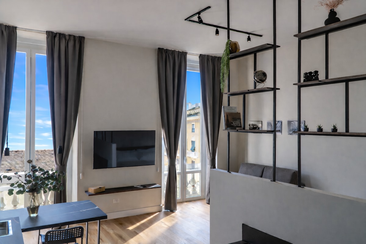 Elegant and bright flat Overlooking the central Piazza Matteotti Opposite the renowned Palazzo Ducale Composed of: -1 distinguished open space living room with comfortable sofa bed and high frescoed ceiling -1 classy dining area with designer table and chairs -1 modern kitchen with all comforts -1 double bedroom located on the mezzanine overlooking the living room also illuminated by the 3 majestic windows -1 modern bathroom complete with glass shower