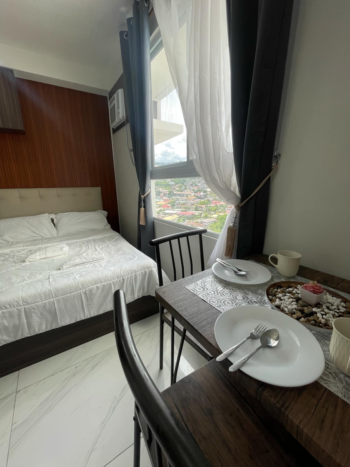 The pool is under repair. Welcome to our cozy loft, Located on the 11th floor with stunning city views. Just minutes away from cebu malls • Features: • Queen-size bed • Convertible couch • 55-inch TV • Air conditioning • High-speed WiFi • Kitchen with essential appliances • Extra Folding bed (available upon request) Building amenities: • Gym • Pool • Paid parking and free parking(until 10pm) Conveniently located near: • Groceries • Cafes • Spa