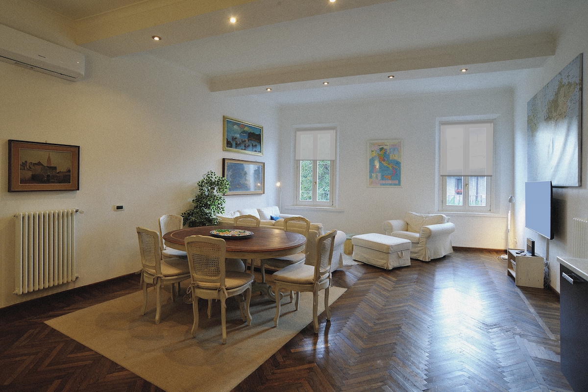 L'appartamento si trova al piano primo di un prestigioso condominio di Modena, a due passi dal centro storico, 5 minuti a piedi al teatro Storchi. L'appartamento (120mq) include 2 grandi camere da letto (con due letti ciascuna), due bagni indipendenti, una cucina abitabile, sala da pranzo e un grande soggiorno. Compreso di finestre vista parco con balcone al patio interno. Permettiamo anche di utilizzare il garage interno, che si trova nel sottosuolo del edificio, per una macchina mediana.