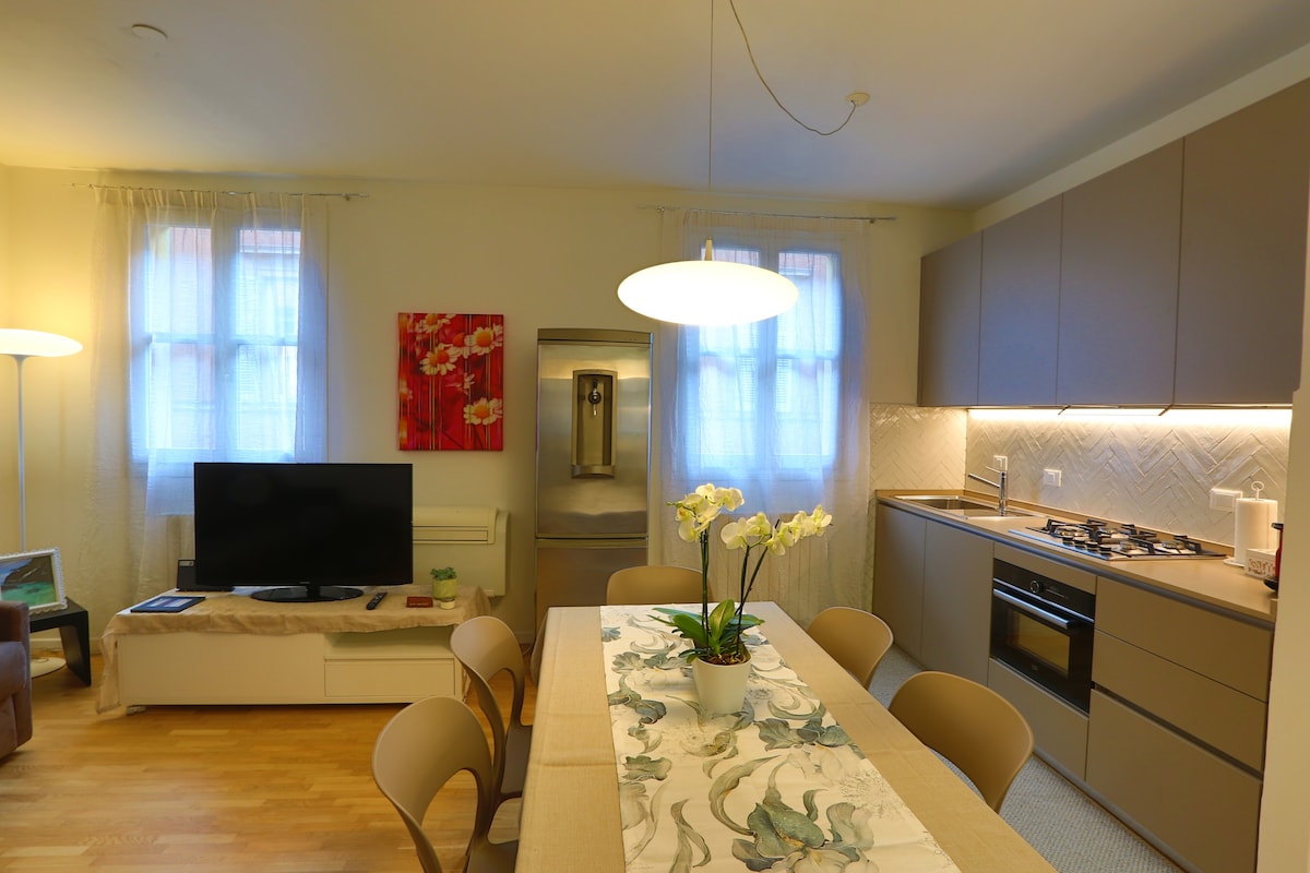 Cleaning costs Euro 60 will be requested by Vikey during online check-in. Welcome to an elegant 100 sq. m. apartment in the historic center of Modena, located in a 17th-century building. The residence combines history and modernity, offering entrance hall with modern kitchen, living room with sofa bed, two bedrooms, two marble bathrooms and a laundry room. Equipped with state-of-the-art appliances, it is a perfect solution for those seeking comfort, elegance and avant-garde.