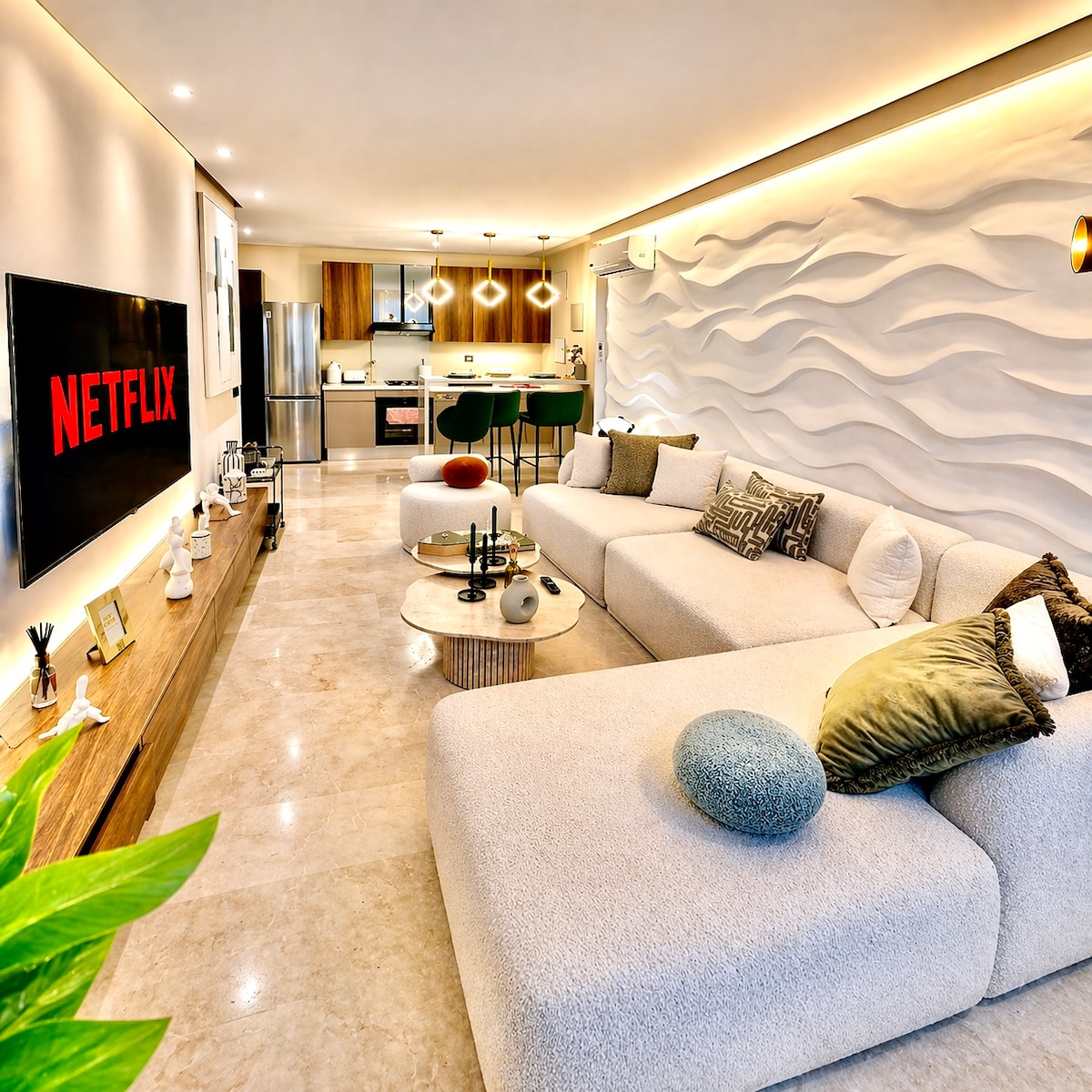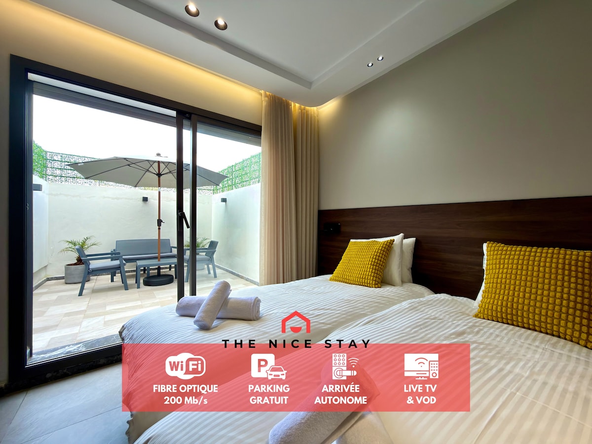 THE NICE STAY – Escale Design & Confort à Sidi Maârouf. Studio moderne 31m² dans une résidence sécurisée avec une terrasse privée de 13m², idéal pour pros, couples & petites familles. Calme absolu à 2 min de Casanearshore. ✦ Nuit : Lit King Size (180x200), confort hôtelier. Lit bébé dispo sur demande. ✦ Tech : Fibre 200 Mbps + Smart TV (BeIN, VOD). ✦ Pratique : Parking s/sol privé & Arrivée autonome. ✦ Confort : Nespresso, Lave-linge séchant & Linge premium. Tout est pensé pour votre confort.