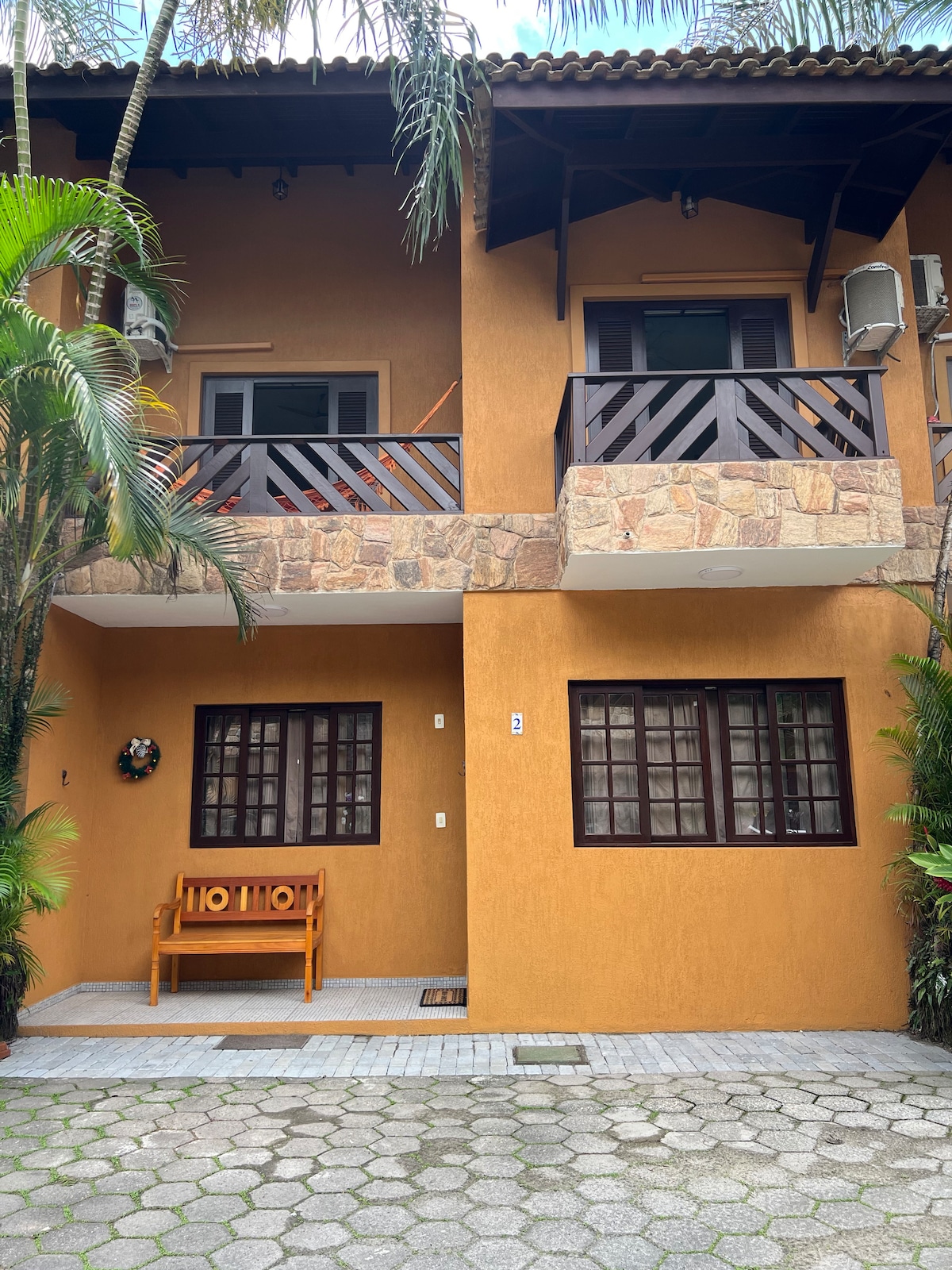 Casa térrea no Condomínio Quinta de Juquehy. Belíssimo projeto de paisagismo a 0,4 km da praia. Condomínio conta com as seguintes comodidades: Portaria 24 horas com monitoramento, serviço de praia, 3 vagas, 2 piscinas, salão de jogos. Possui: Ar condicionado em todos os cômodos e fornecimento de roupas de cama e toalhas. São 3 suítes com 2 camas de solteiro (podendo ser unidas formando uma de casal) e uma bicama. Cada suíte acomoda, portanto, 3 pessoas. Deck integrado com a churrasqueira.