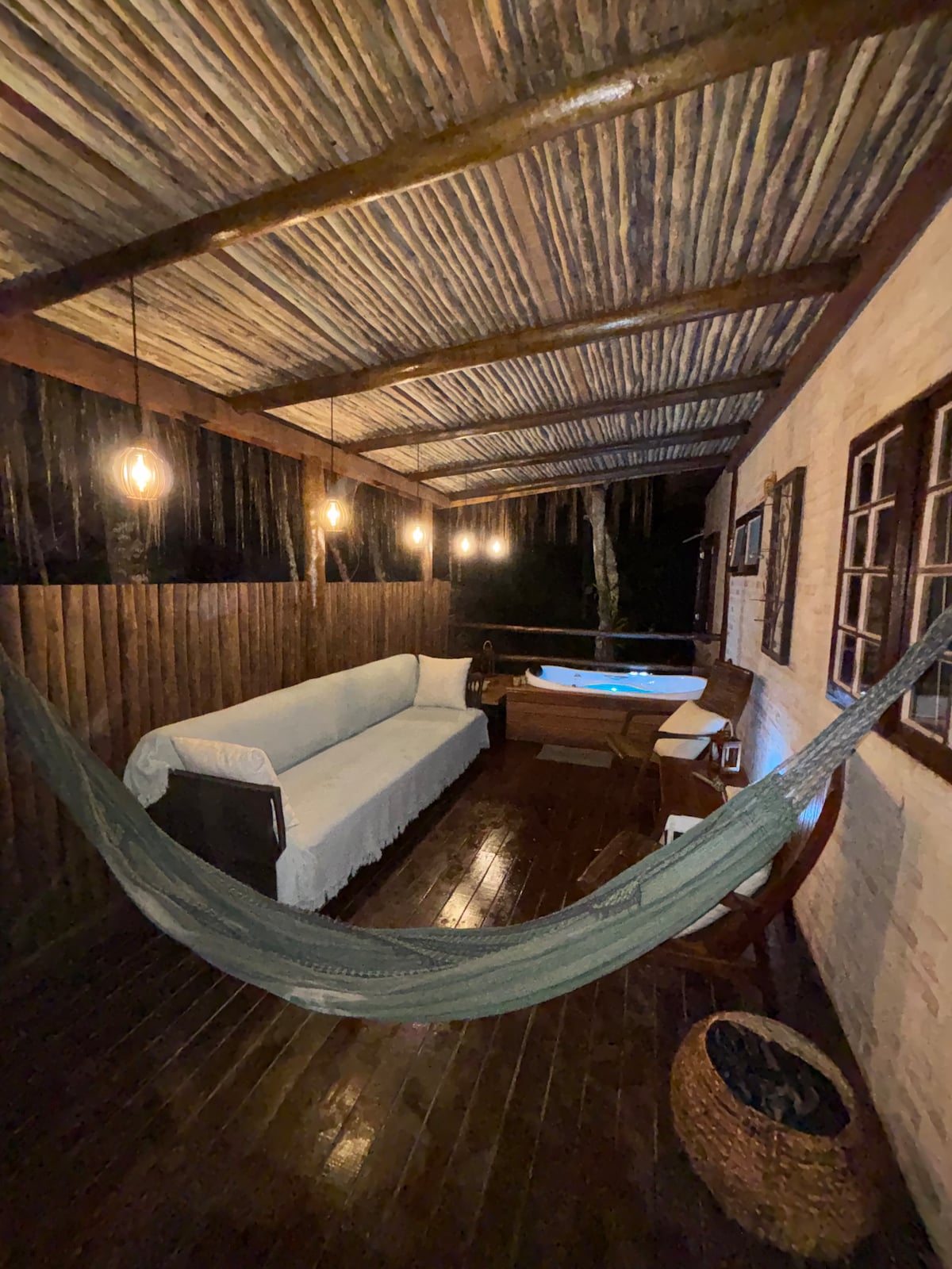 Um bangalô construído artísticamente em cada detalhe...banheira aberta para a mata com teto de vidro passam a sensação de estar imerso na natureza, com uma Figueira centenária de frente e muitos pássaros...intimista e acolhedor em conexão com a Natureza em contato com essa área de reserva da Mata Atlântica. O outro chuveiro quente fica no deck aberto para a mata e é delicioso de dia ou à noite com céu de estrelas e Luar.